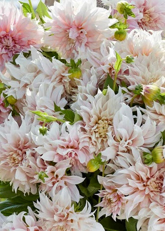 The queen of the dahlias — ‘Café au Lait’ is all soft blush, creamy latte tones, and oversized, petal-packed blooms that feel straight out of a bridal bouquet. Her flowers open in warm, shifting shades that move from champagne to blush to antique cream depending on the light. With long, elegant stems and generous production, she remains one of the most beloved varieties for weddings, design work, and any garden that leans romantic.
